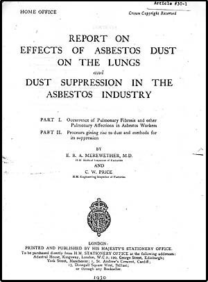 Mesothelioma and Asbestos HistoryA brief chronology of what the owners and managers of asbestos companies knew, and when they knew it.1890s Asbestos, which previously had few industrial uses, becomes a raw material for large manufacturing industries, exposing large numbers of workers to asbestos dust for the first time. Asbestos-caused disease often develops decades after a person was first exposed. As a result, it was not until the early 1900s that large numbers of workers developed symptoms.David Kotelchuck, "Asbestos: ''The Funeral Dress of Kings' - and Others" in Dying for Work: Workers' Safety and Health in Twentieth-Century America, ed. by David Rosner and Gerald Markowitz, Indiana University Press, Bloomington, IN 1987, p193 1918 A Prudential Insurance Company official notes that life insurance companies will not cover asbestos workers, because of the "health-injurious conditions of the industry." .Barry I. Castleman, Asbestos: Medical and Legal Aspects, 4th edition, Aspen Law and Business, Englewood Cliffs, NJ 1996, p.5-6 1930 Major asbestos company Johns-Manville produces report, for internal company use only, about medical reports of asbestos worker fatalities. Barry I. Castleman, Asbestos: Medical and Legal Aspects, 4th edition, Aspen Law and Business, Englewood Cliffs, NJ 1996, p.663 1932 Letter from U.S. Bureau of Mines to asbestos manufacturer Eagle-Picher states: "It is now known that asbestos dust is one of the most dangerous dusts to which man is exposed." .Paul Brodeur, Outrageous Misconduct: The Asbestos Industry on Trial, Pantheon Books, New York NY, 1985, p.327 1933 Metropolitan Life Insurance Co. doctors find that 29 percent of workers in a Johns-Manville plant have asbestosis. Barry I. Castleman, Asbestos: Medical and Legal Aspects, 4th edition, Aspen Law and Business, Englewood Cliffs, NJ 1996, p.26 Johns-Manville officials settle lawsuits by 11 employees with asbestosis on the condition that the employees' lawyer agree to never again "directly or indirectly participate in the bringing of new actions against the Corporation." .Paul Brodeur, Outrageous Misconduct: The Asbestos Industry on Trial, Pantheon Books, New York NY, 1985, p.114 1934 Officials of two large asbestos companies, Johns-Manville and Raybestos-Manhattan, edit an article about the diseases of asbestos workers written by a Metropolitan Life Insurance Company doctor. The changes minimize the danger of asbestos dust. .Paul Brodeur, Outrageous Misconduct: The Asbestos Industry on Trial, Pantheon Books, New York NY, 1985, p.114-15 1935 Officials of 1936 A group of asbestos companies agrees to sponsor research on the health effects of asbestos dust, but require that the companies maintain complete control over the disclosure of the results. .Barry I. Castleman, Asbestos: Medical and Legal Aspects, 4th edition, Aspen Law and Business, Englewood Cliffs, NJ 1996, p.587 1942 Internal Owens-Corning corporate memo refer to "medical literature on asbestosis . . . . scores of publications in which the lung and skin hazards of asbestos are discussed." .Barry I. Castleman, Asbestos: Medical and Legal Aspects, 4th edition, Aspen Law and Business, Englewood Cliffs, NJ 1996, p.195 1942 or 1943 The president of Johns-Manville says that the managers of another asbestos company were "a bunch of fools for notifying employees who had asbestosis." When one of the managers asks, "do you mean to tell me you would let them work until they dropped dead?" The response is reported to have been, "Yes. We save a lot of money that way." .Testimony of Charles H. Roemer, Deposition taken April 25, 1984, Johns-Manville Corp., et al v. the United States of America, U.S. Claims Court Civ. No. 465-83C, cited in Barry I. Castleman, Asbestos: Medical and Legal Aspects, 4th edition, Aspen Law and Business, Englewood Cliffs, NJ 1996, p.581 1944 Metropolitan Life Insurance Company report finds 42 cases of asbestosis among 195 asbestos miners. .Barry I. Castleman, Asbestos: Medical and Legal Aspects, 4th edition, Aspen Law and Business, Englewood Cliffs, NJ 1996, p.654 1951 Asbestos companies remove all references to cancer before allowing publication of research they sponsor. .Barry I. Castleman, Asbestos: Medical and Legal Aspects, 4th edition, Aspen Law and Business, Englewood Cliffs, NJ 1996, p.71 1952 Dr. Kenneth Smith, Johns-Manville medical director, recommends (unsuccessfully) that warning labels be attached to products containing asbestos. Later Smith testifies: "It was a business decision as far as I could understand . . . the corporation is in business to provide jobs for people and make money for stockholders and they had to take into consideration the effects of everything they did and if the application of a caution label identifying a product as hazardous would cut into sales, there would be serious financial implications." .Barry I. Castleman, Asbestos: Medical and Legal Aspects, 4th edition, Aspen Law and Business, Englewood Cliffs, NJ 1996, p.666 1953 National Gypsum's safety director writes to the Indiana Division of Industrial Hygiene, recommending that acoustic plaster mixers wear respirators "because of the asbestos used in the product." Another company official notes that the letter is "full of dynamite," urges that it be retrieved before reaching its destination. A memo in the files notes that the company "succeeded in stopping" the letter, which "will be modified." .Barry I. Castleman, Asbestos: Medical and Legal Aspects, 4th edition, Aspen Law and Business, Englewood Cliffs, NJ 1996, p.669-70 1964 Dr. Irving Selikoff publishes a study of asbestos workers in the Journal of the American Medical Association, proving that people who work with asbestos-containing materials have an abnormal incidence of asbestosis, lung cancer, and mesothelioma. .Barry I. Castleman, Asbestos: Medical and Legal Aspects, 4th edition, Aspen Law and Business, Englewood Cliffs, NJ 1996, p.126 1966 Raybestos-Manhattan official writes: "We feel th
